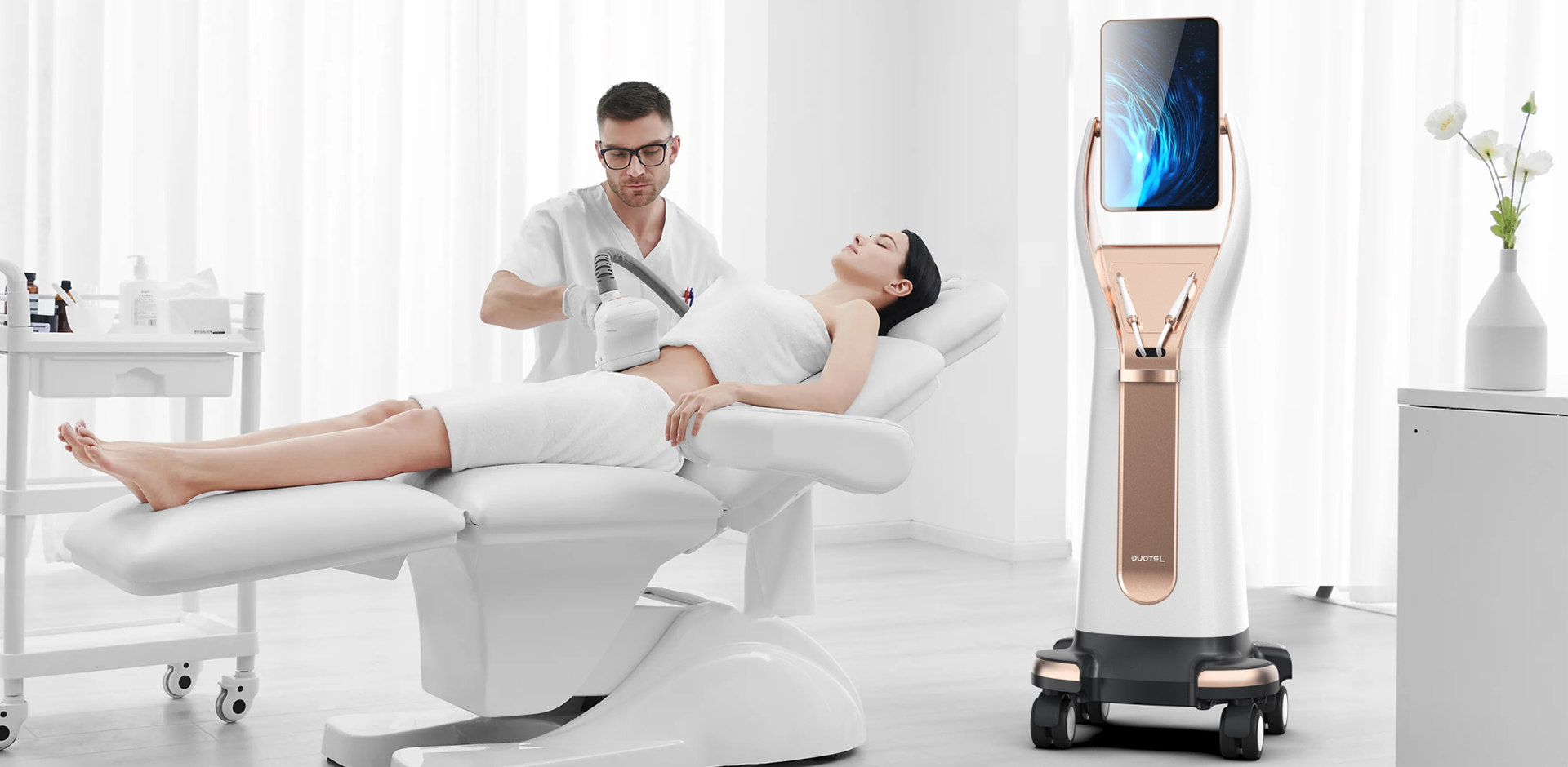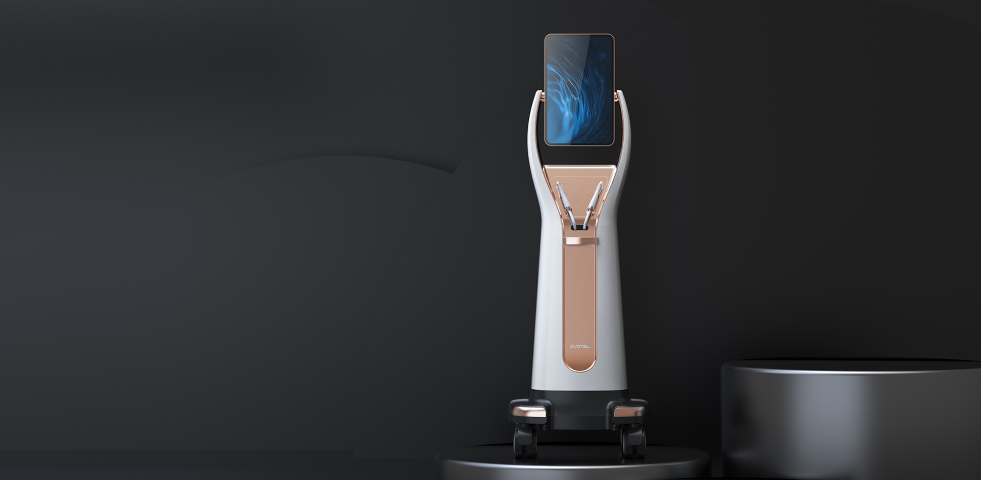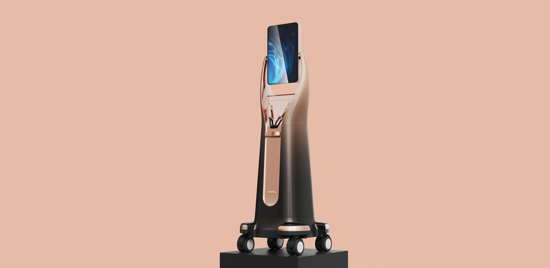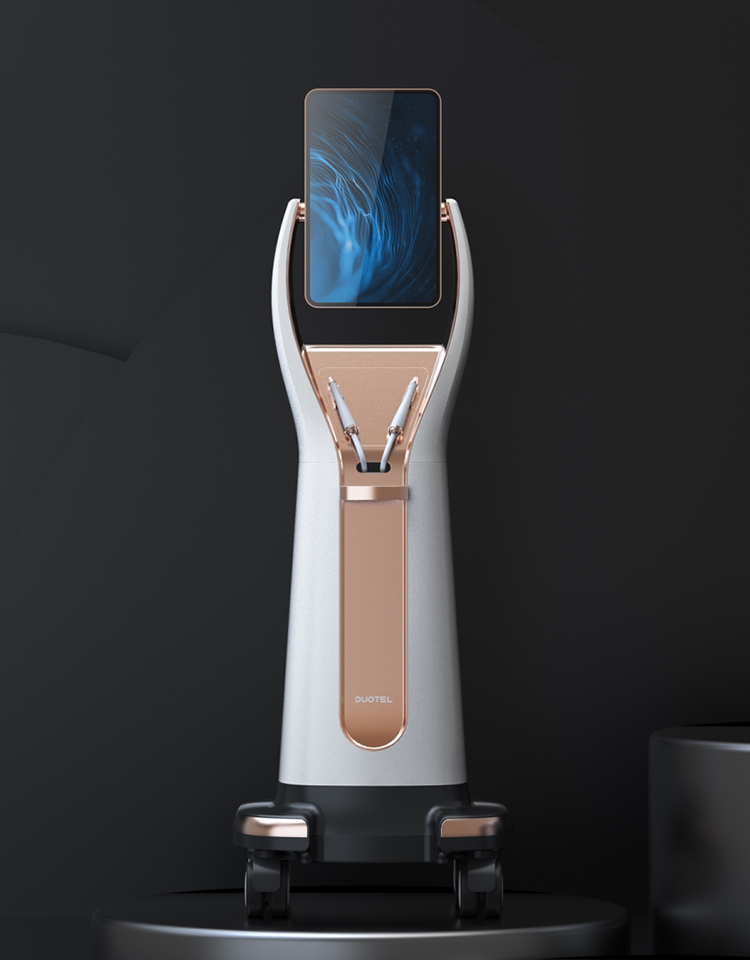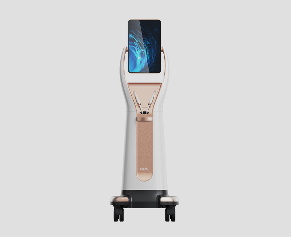 客户希望把原有的台式美容仪设备改成一款落地式台车形美容仪,要求屏幕采用13寸大屏设计,手柄摆放位置要符合人机方便操作,手柄线做一些隐藏设计。